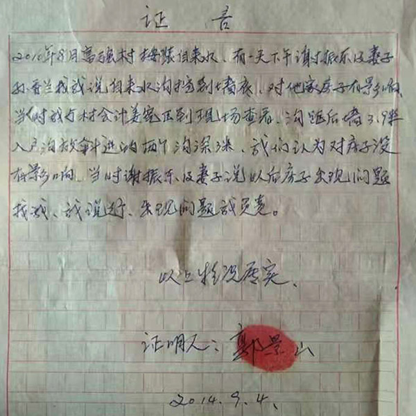 结语:2010年8月至今,谢立娟及家人为房屋事情,一直讨说法未果。想不通的有四点:第一点,乡政府先后给谢立娟(家人)签发了三次《信访事项处理意见书》,每次提到有《16位村民代表意见书》,为什么不予公开,哪条法律规定;第二点,乡政府组成工作组成员、乡建、司法会同市住建局质监站专业人员到现场测查,其测查结果为什么只能直接体现在处理意见书中无其他纸质文件,哪条法律规定;第三点,国峰公司在2013年4月7日许可经营项目已变更登记为“无”,2022年该公司仍使用该证书开展经营活动,属于“无证经营”,难道乡政府领导不懂法。 第四点,乡政府领导拿着没有资质公司的鉴定报告,证明谢立娟房屋跟开挖自来水管道无关,其理由能否成立。希望此事能够引起相关部门高度重视,及时查处。 |