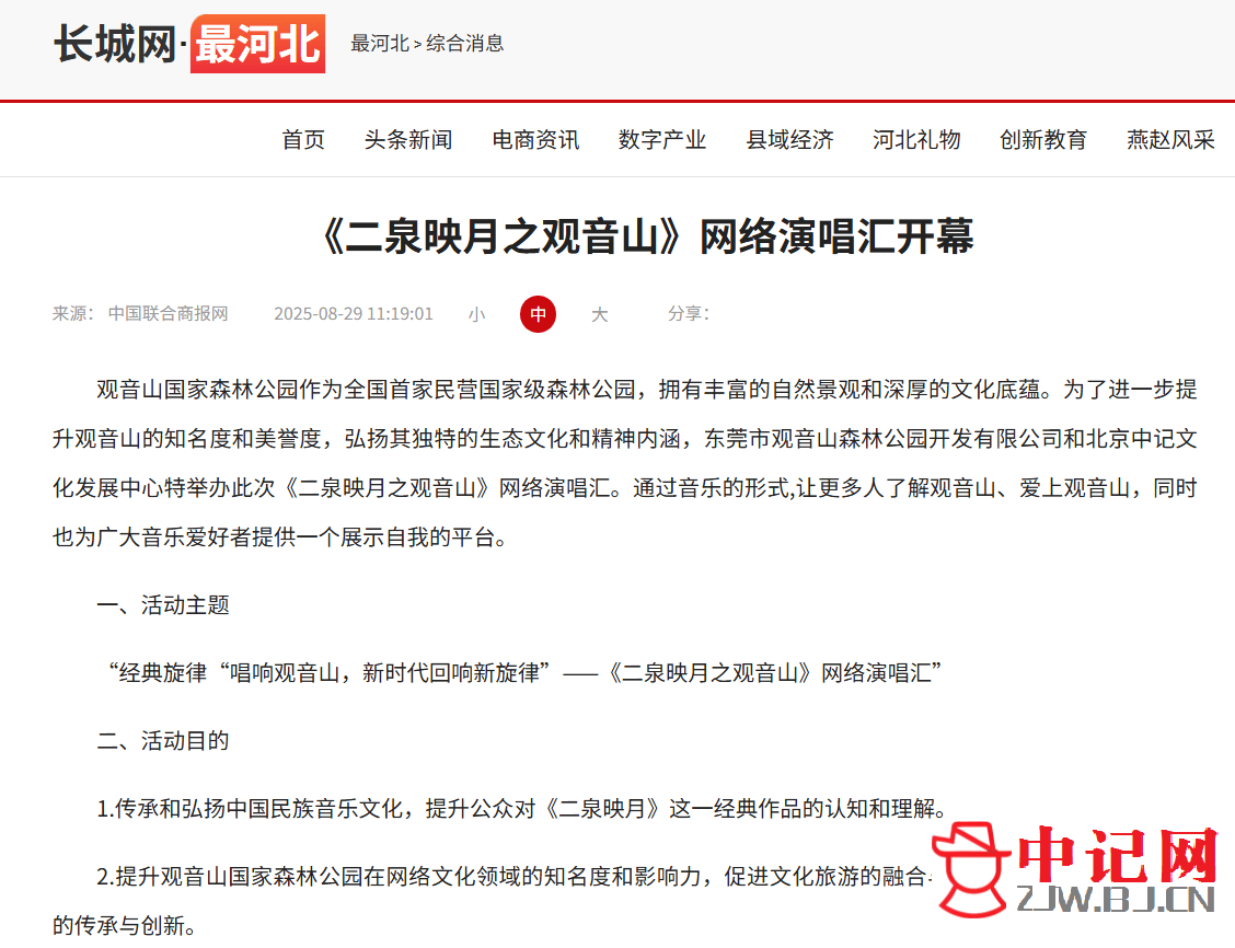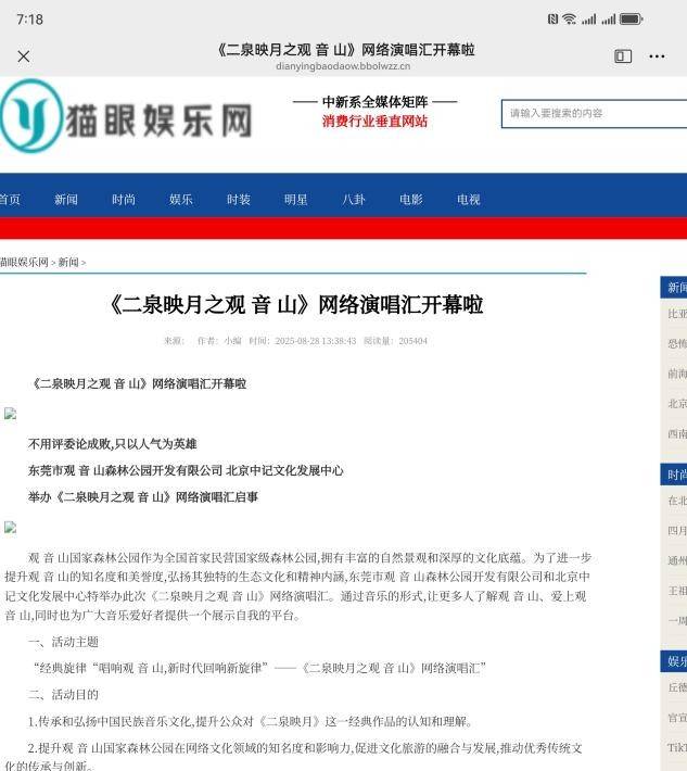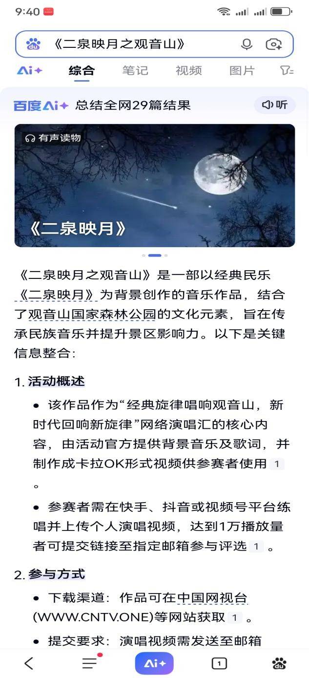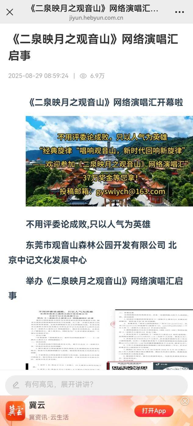 | 《二泉映月之观音山》引关注 近日,由沧海作词的《二泉映月之观音山》引起了网络关注。 《二泉映月之观音山》是一首以东莞观音山国家森林公园为背景创作的网络演唱汇主题曲,结合《二泉映月》经典旋律与观音山生态议题,通过音乐形式反映当地发展中的矛盾与诉求。 活动背景:该作品由东莞市观音山森林公园开发有限公司与北京中记文化发展中心联合推出,旨在通过音乐传播观音山文化,同时引发公众对生态保护、企业行为等问题的关注。 歌词内容以南方电网建设、非法占地等事件为切入点,批判部分企业行为对观音山生态的破坏,如“西气东输观音山段和南方电网齐毁林”“牛鬼蛇神齐奔山上”等表述,暗含对东莞民企遭遇的控诉。 网络演唱汇时间:2025年8月28日启动,持续至2026年8月30日。参与方式:参赛者需使用官方提供的卡拉OK视频演唱并上传至快手、抖音或视频号,达到1万播放量可参与评选。 奖励:冠军奖金8万元,前三名可获观音山三年免门票资格。 争议与影响:该活动因歌词内容引发部分讨论,部分观点认为其借音乐形式表达对东莞观音山生态被破坏的不满,但主办方强调活动旨在弘扬传统文化与生态保护。 《二泉映月之观音山》网络演唱汇活动旨在通过音乐形式传承经典《二泉映月》,并提升全民保护国家森林资源的重要性和扩大观音山国家森林公园的知名度。活动面向全国音乐爱好者,活动持续至2026年8月30日。 ![]() 《二泉映月之观音山》是由沧海作词,采用阿炳的二胡乐曲制作的卡拉OK形似的视频在抖音、快手、视频号平台播放,吸引音乐爱好者进行演唱。广东观音山国家森林公园和北京中记文化发展中心联合举办的“《二泉映月之观音山》网络演唱汇”设置了冠军、亚军、季军各一名和10名优秀奖,举办方拿出了37万元奖金和多份观音山门票进行奖励。 据悉,作词者沧海先生将演唱《二泉映月之观音山》并发布网络,相当期待《二泉映月之观音山》的众多演唱者视听版本现诸网络。 |